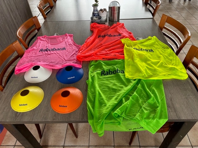 Omdat wij bankieren bij de Rabobank en deelnemen aan ClubHub, mochten wij namens Rabobank een prachtig trainingspakket ontvangen. Dit pakket bestaat uit 400 100% gerecyclede pionnen en 100 trainingshesjes, een mooie stap richting duurzaam sporten!
